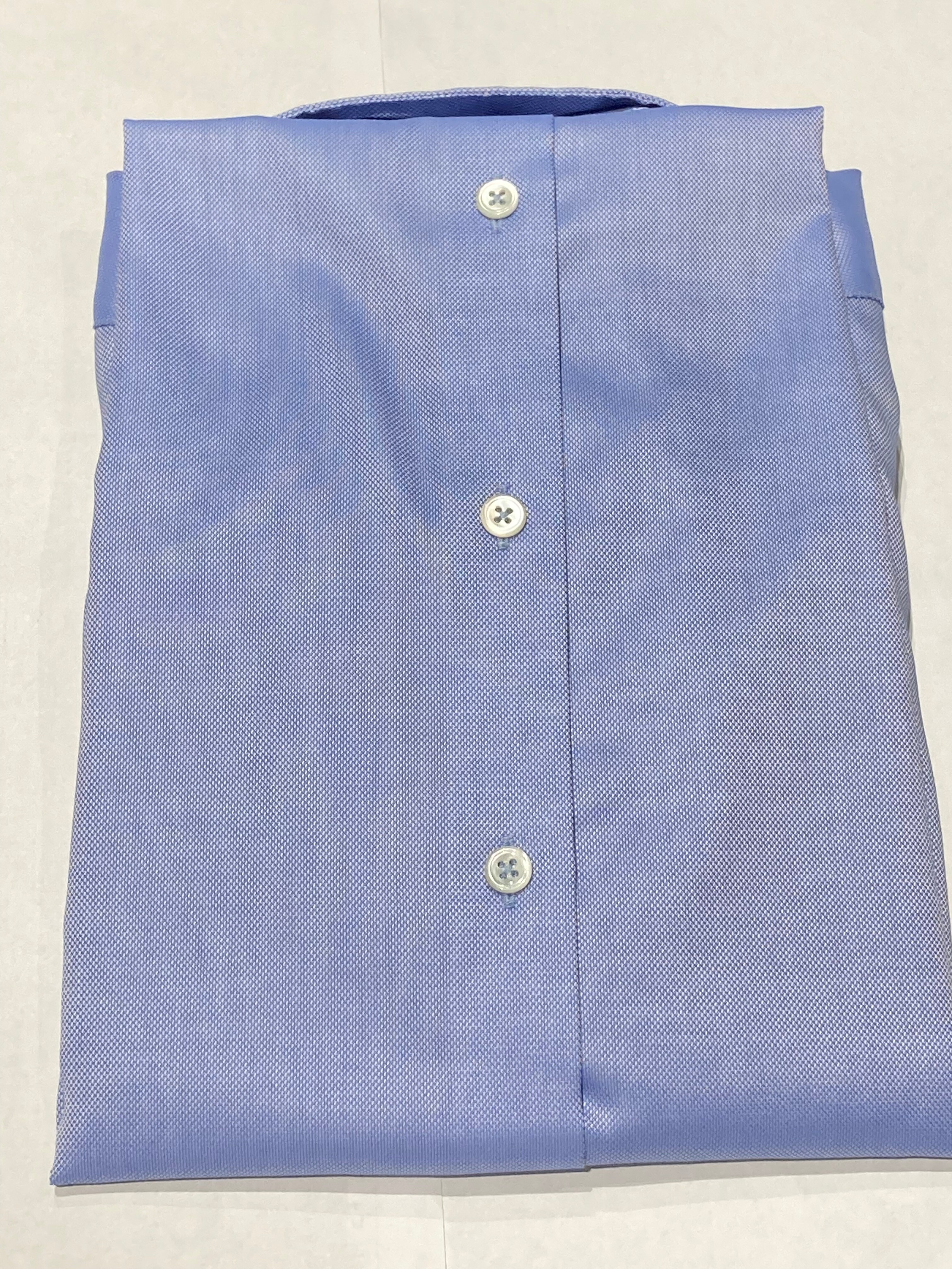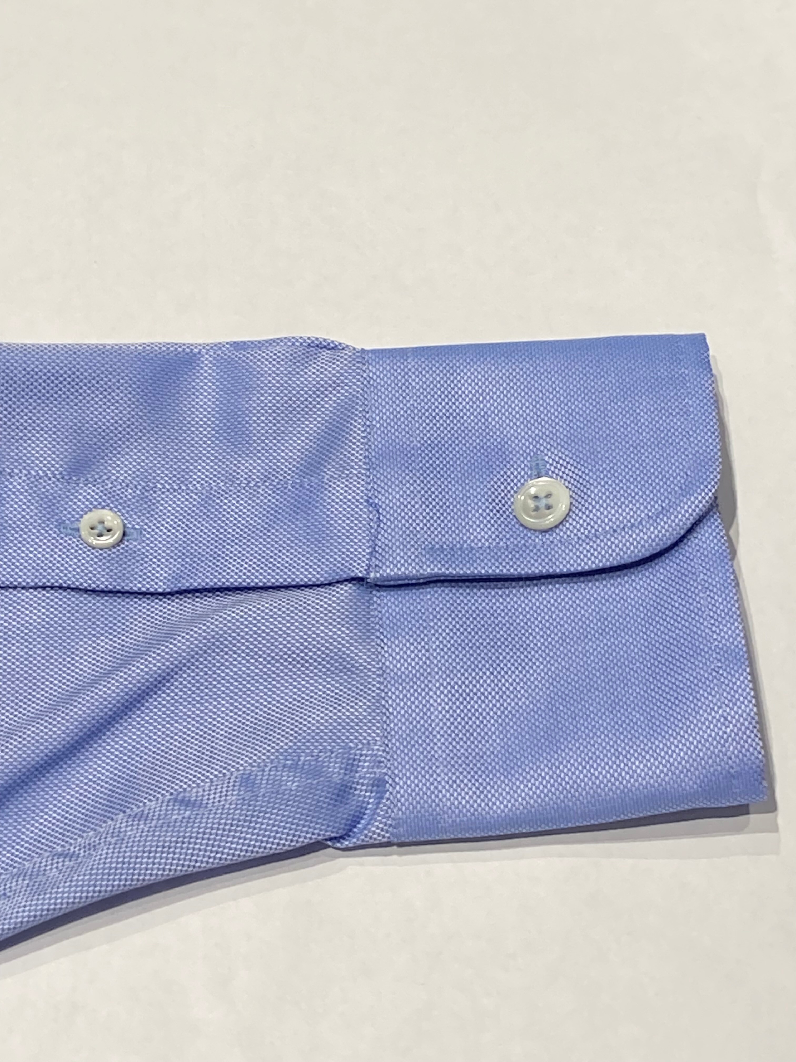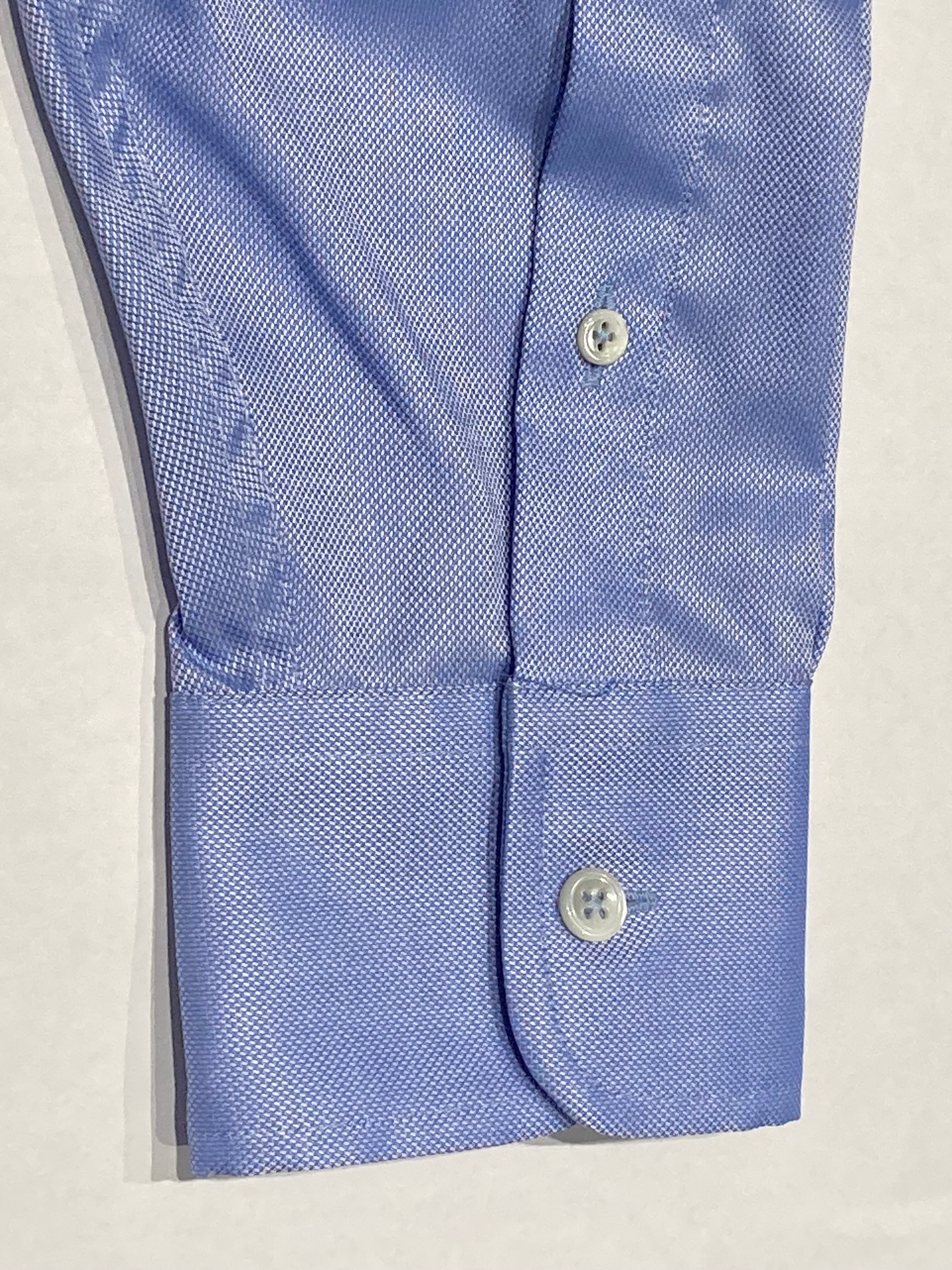 Medium blue dobby shirt with round barrel cuffs and classci collar. Fabric code: P14B. Dobby weave. Customize the collar size, sleeve length and fit. Extra collar and cuffs available to make your shirt last longer. Optionally embroider your name or monogram.