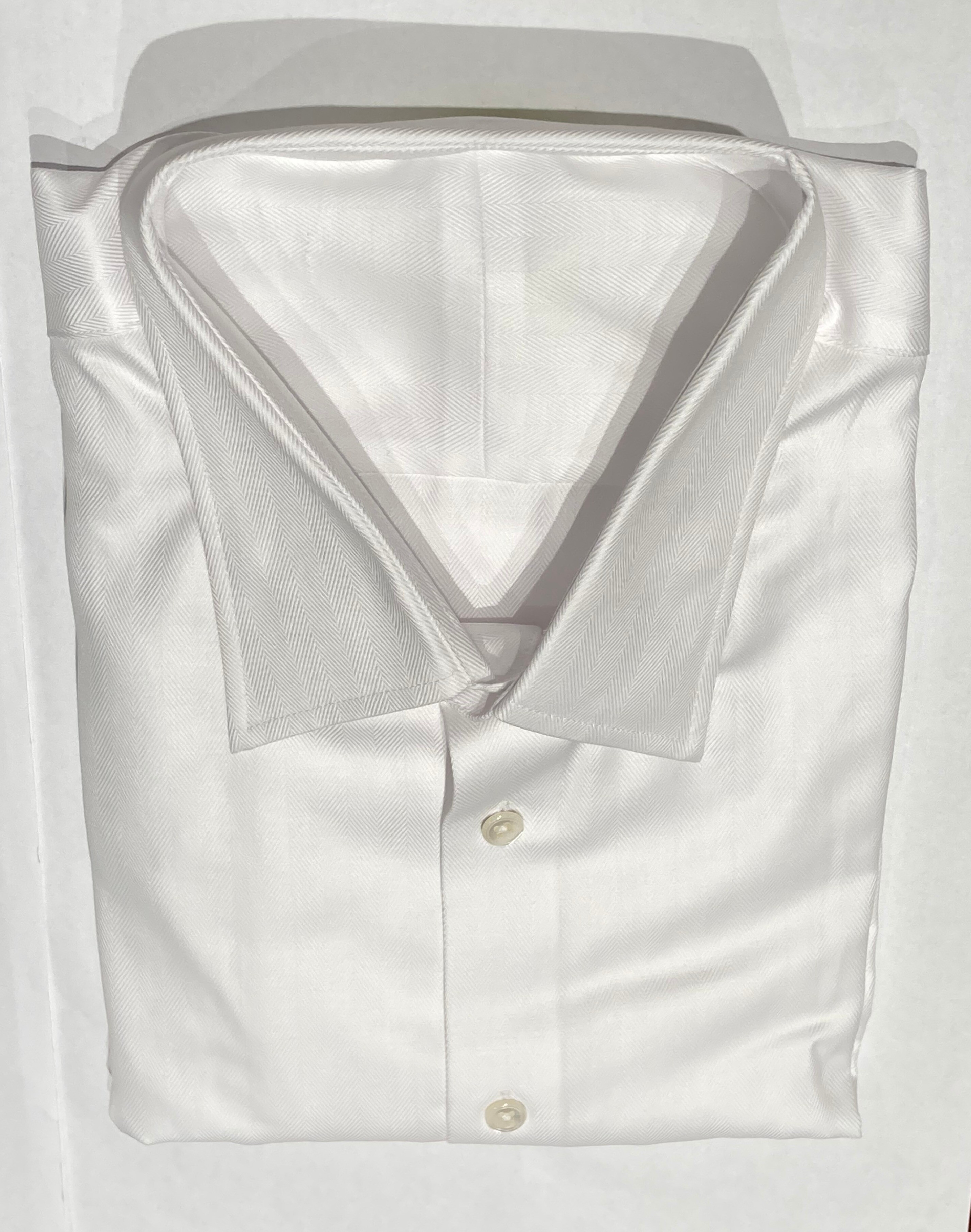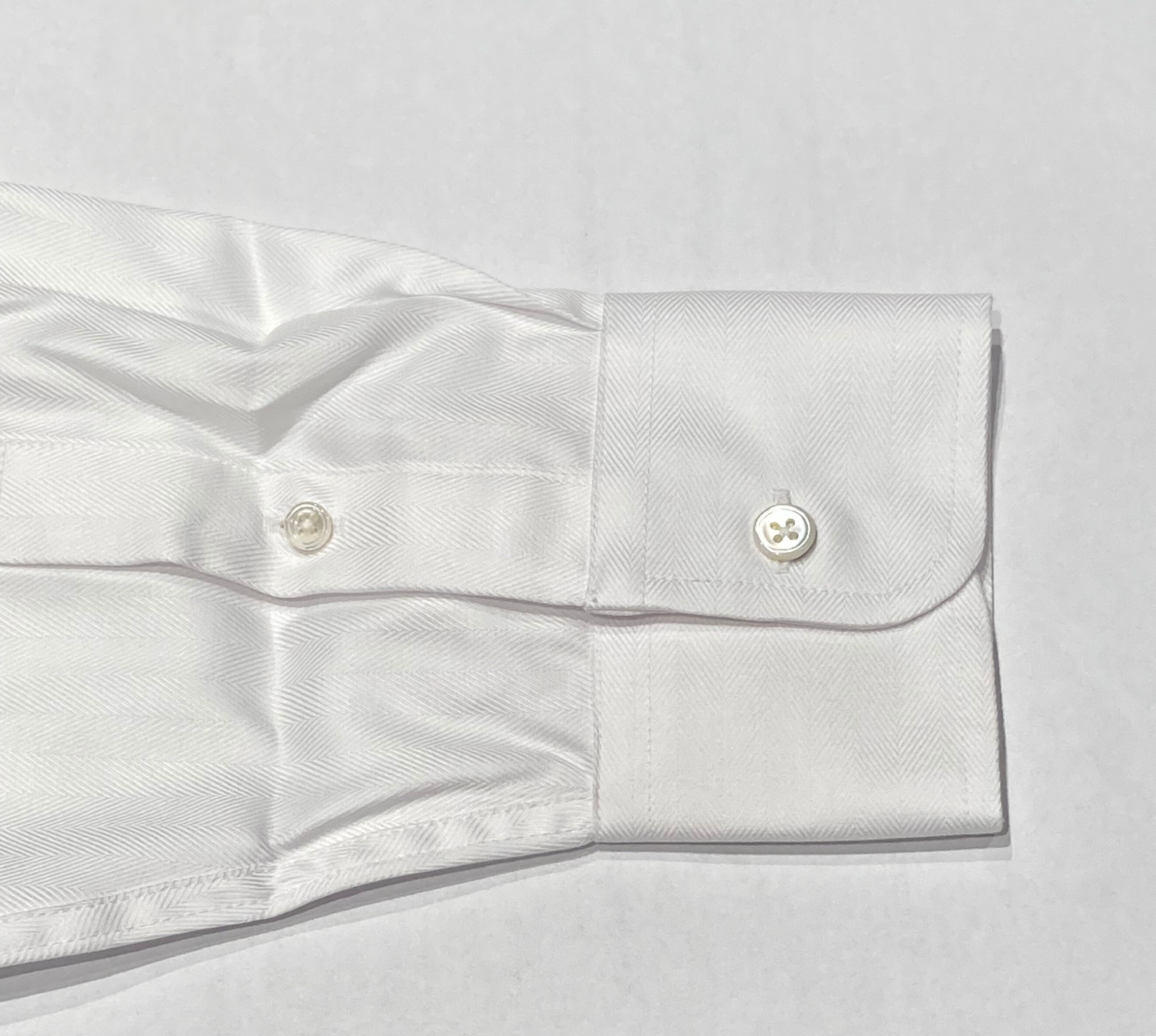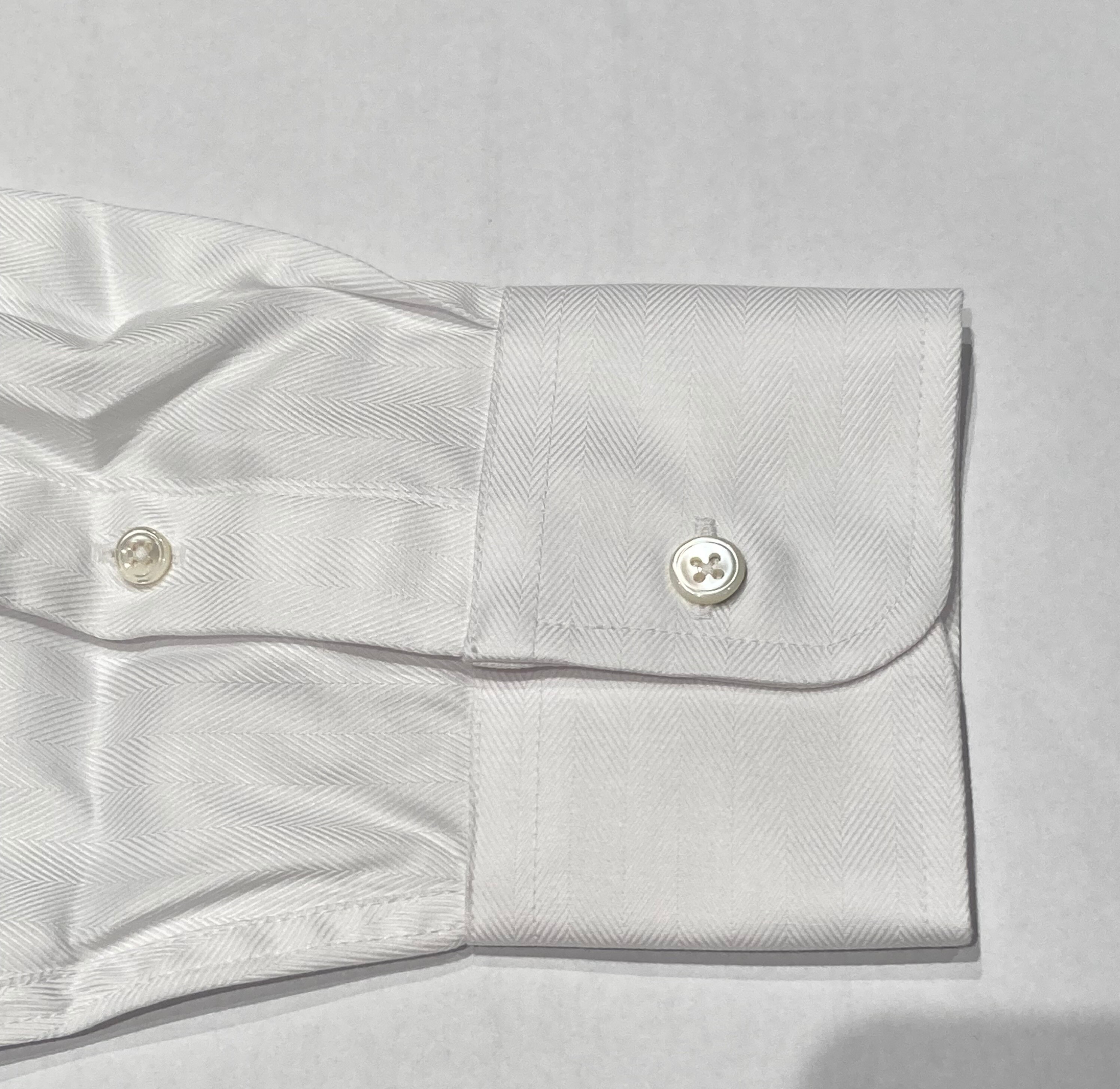 White wide herringbone shirt with round barrel cuff, classic collar. Fabric code: LP14. Herringbone weave. Customize the collar size, sleeve length and fit. Extra collar and cuffs available to make your shirt last longer. Optionally embroider your name or monogram.