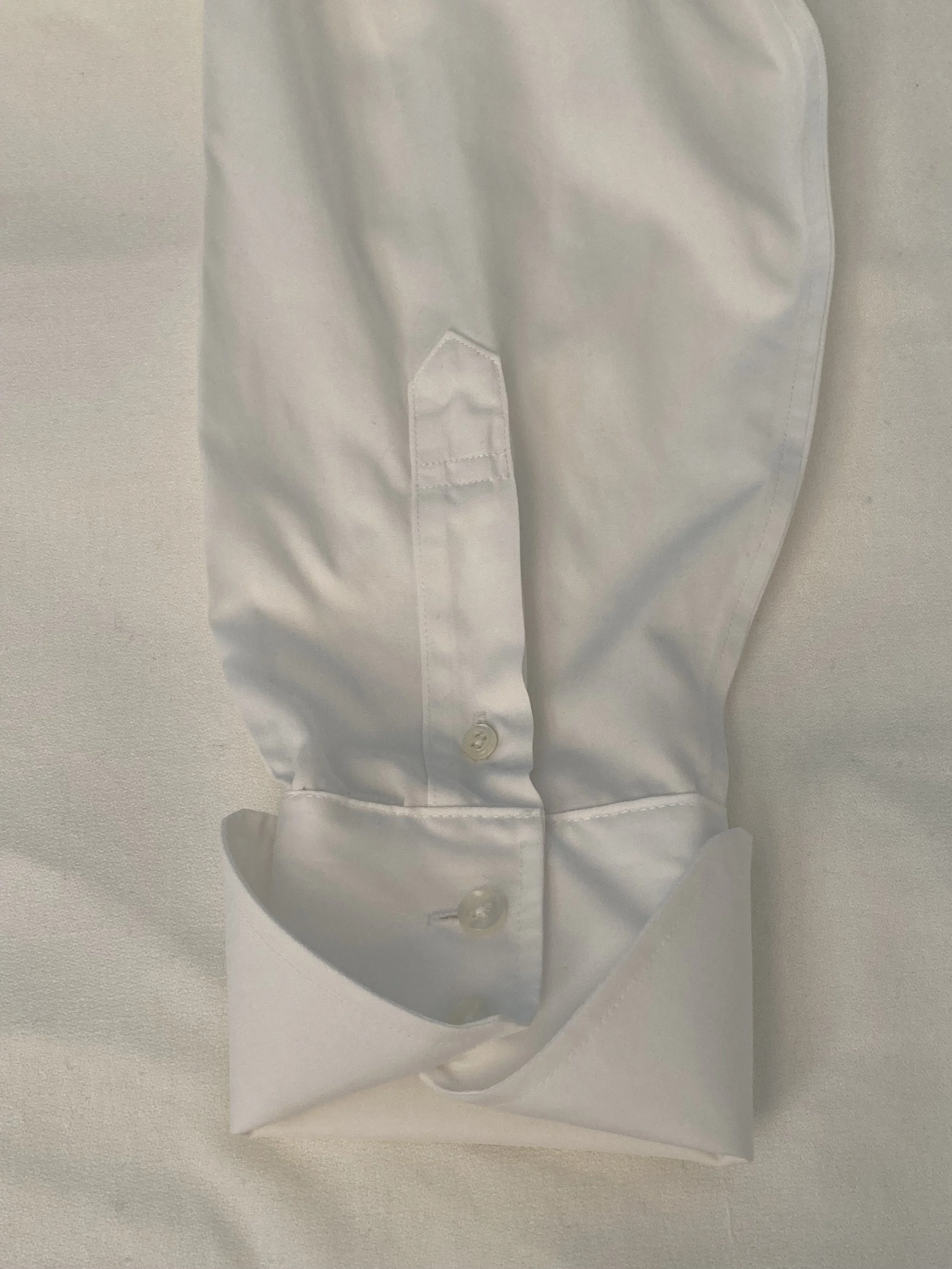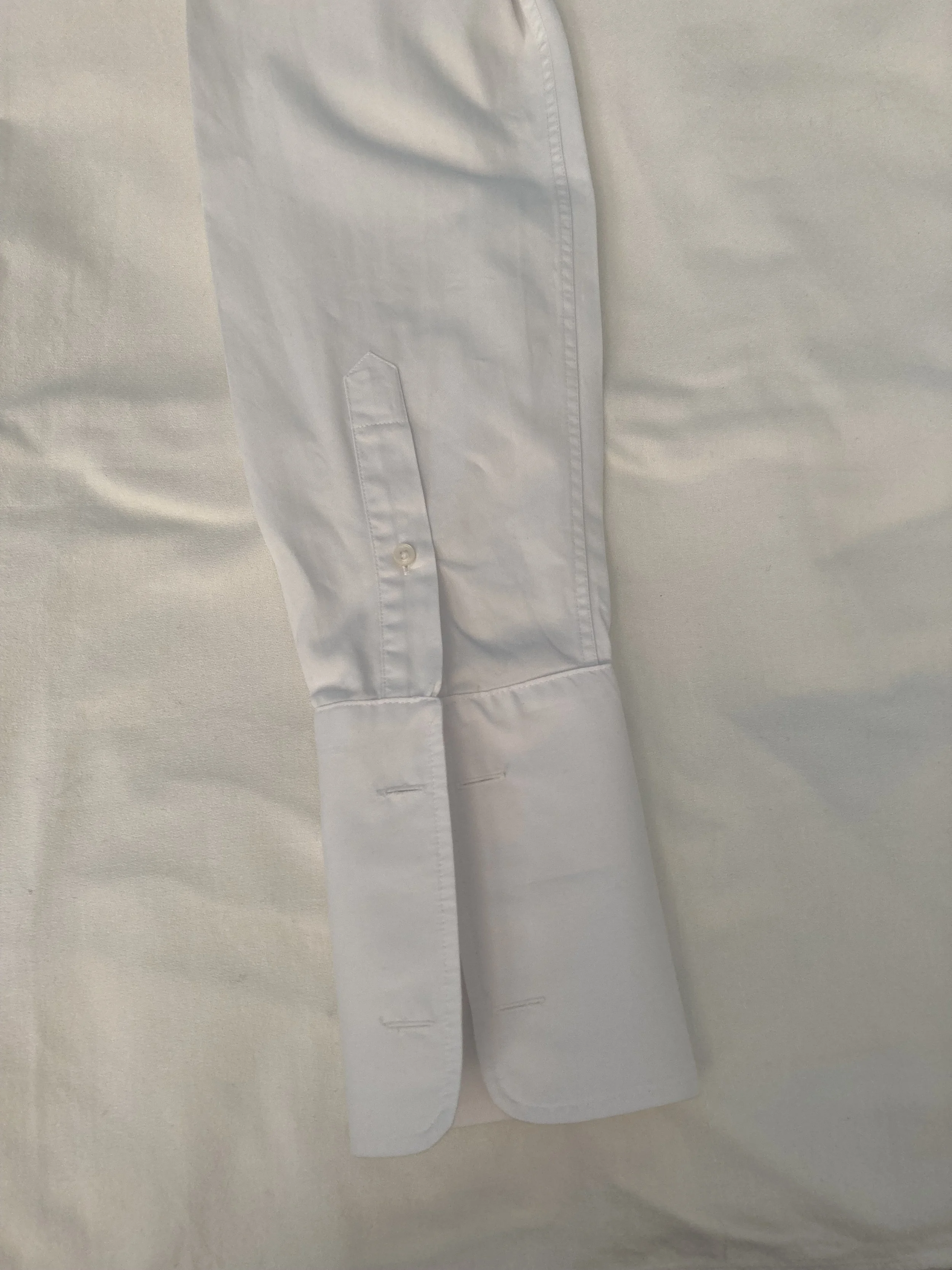 Figure 1: This shirt sleeve was shortened by cutting from the cuffs leading the gauntlet button to be too close to the cuff and throwing off the balance between the placket and cuff.
